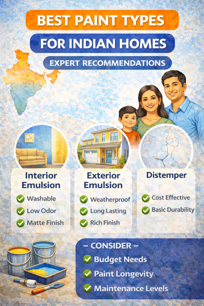 This expert guide explains the best paint types for Indian homes, where to use them, climate-wise recommendations, durability comparisons, and cost considerations—so you can make the right decision the first time.