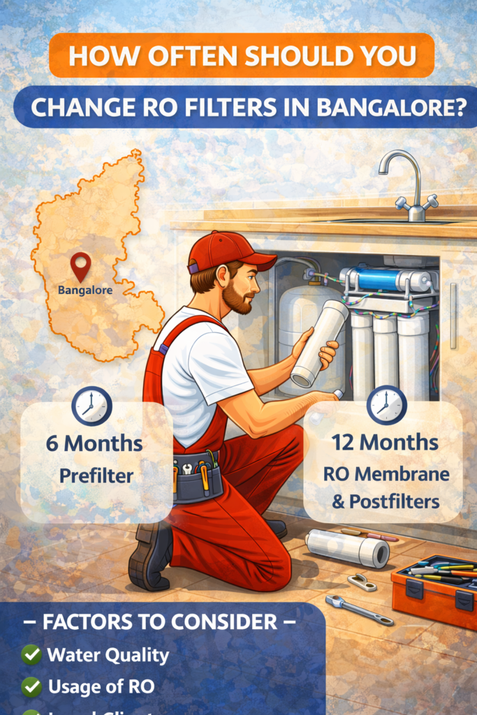 In Bangalore, RO filters must be replaced more frequently due to mixed water sources and high TDS. Delaying replacement leads to unsafe drinking water, expensive repairs, and health risks.